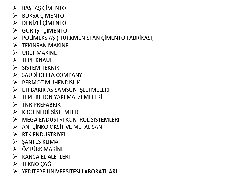 Ürün /hizmet guruplarına göre oluşturulmuş bazı referanslarımız bulunmaktadır. Detaylı referans ve uygulama için firmamızla telefon (0312-3548258) ya da mail yoluyla (buken@bukenmakina.com) aracılığıyla iletişime geçebilirsiniz.